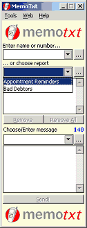 An example of such a report might be: Your database has an appointment book, and you wish to send a MemoTxt message to all people with appointments on a certain day to remind them of their impending appointment. After executing the report, all people with mobile phones who have an appointment for the chosen day will appear in the numbers list, ready to be sent.